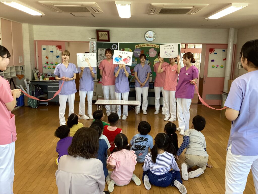 幼稚園での歯磨き教室を行いました🦷✨学生たちが、グループごとに年少さんから年長さんまでの園児たちに、歯の大切さを楽しく学んでもらいま…