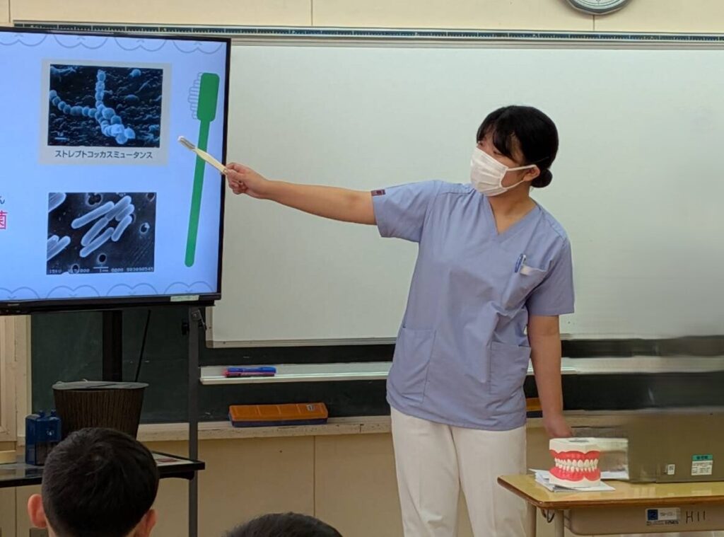 小学校を訪問し、むし歯の原因や正しい歯の磨き方についての講話と、個別での歯みがき指導を行いました。 個別指導では、歯の磨き残しを染め…