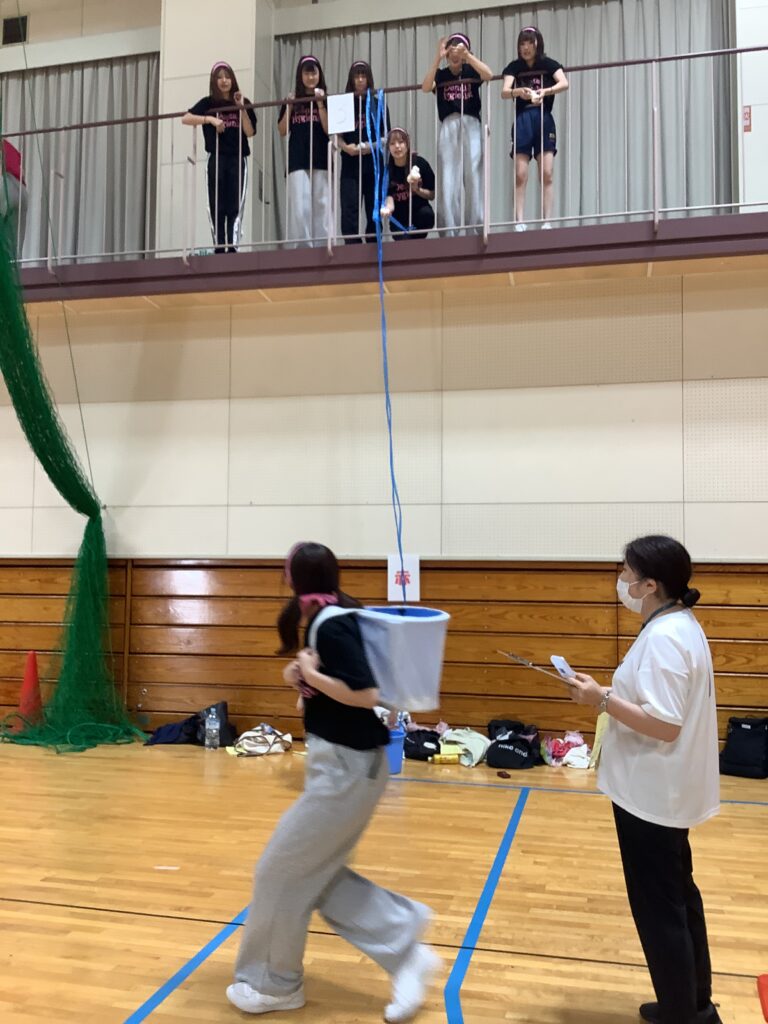 「玉入れ」では、体育館の2階キャットウォークから、1階にいる学生が背負ったかごをめがけて玉を投げ入れます。