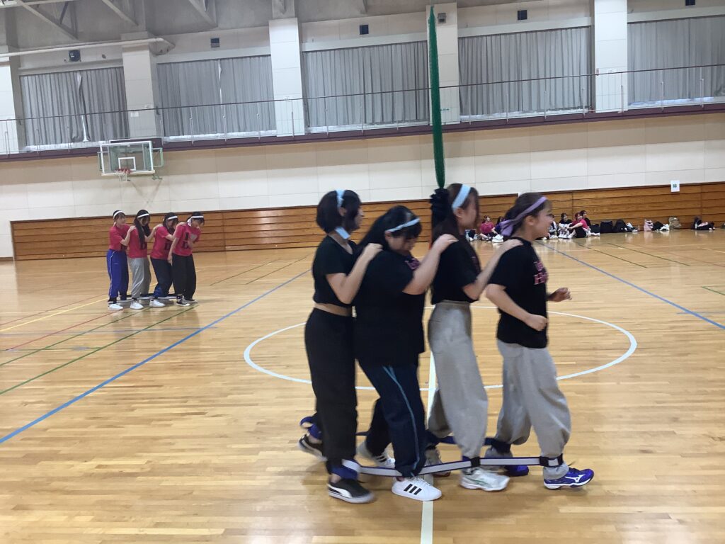 「ムカデ競争」では、4名ずつの足をバンドで結んで走り、体育館を往復しました。