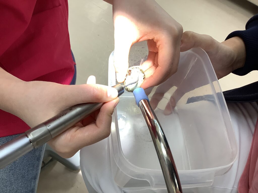 体験では、歯石を取る機械を使用して「うずらのたまご」の柄を取る実習に挑戦しました。